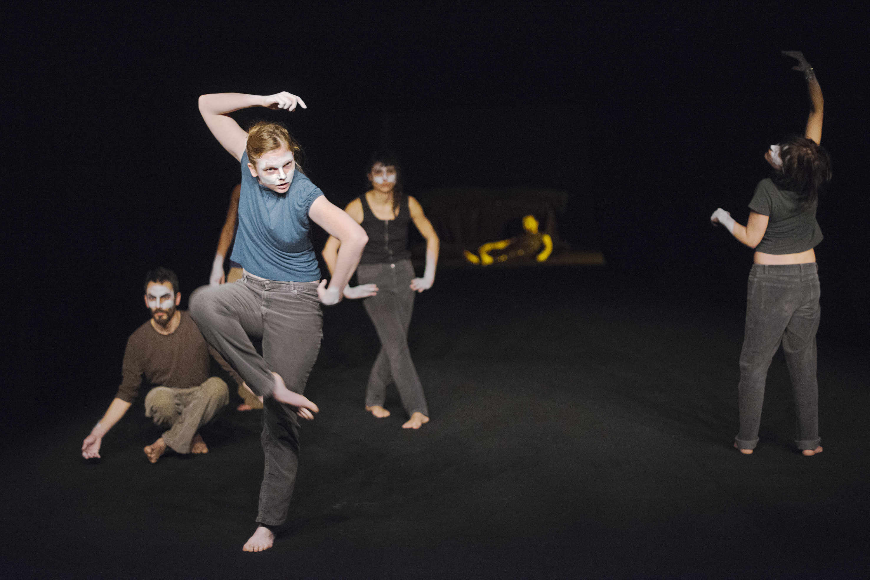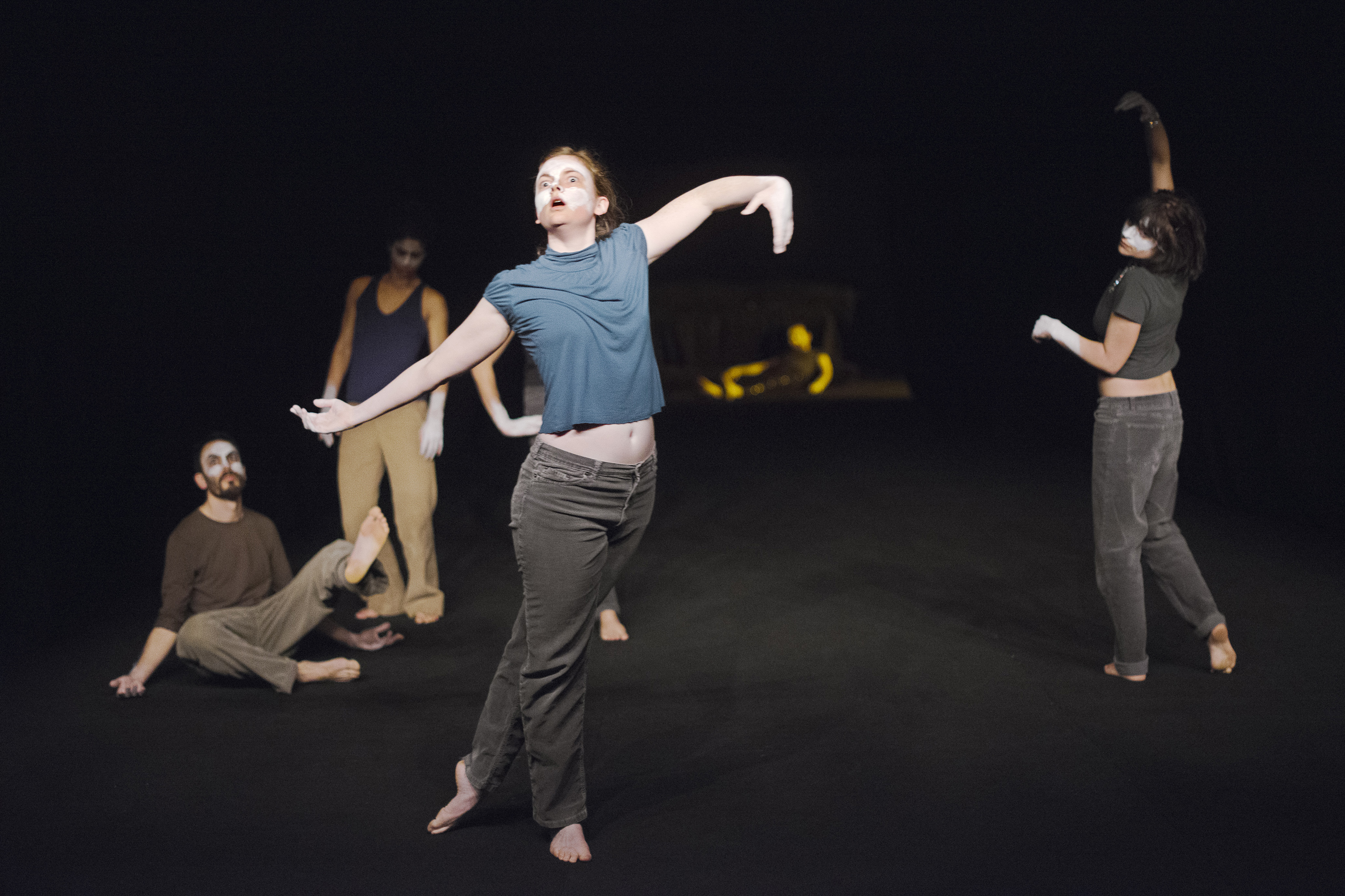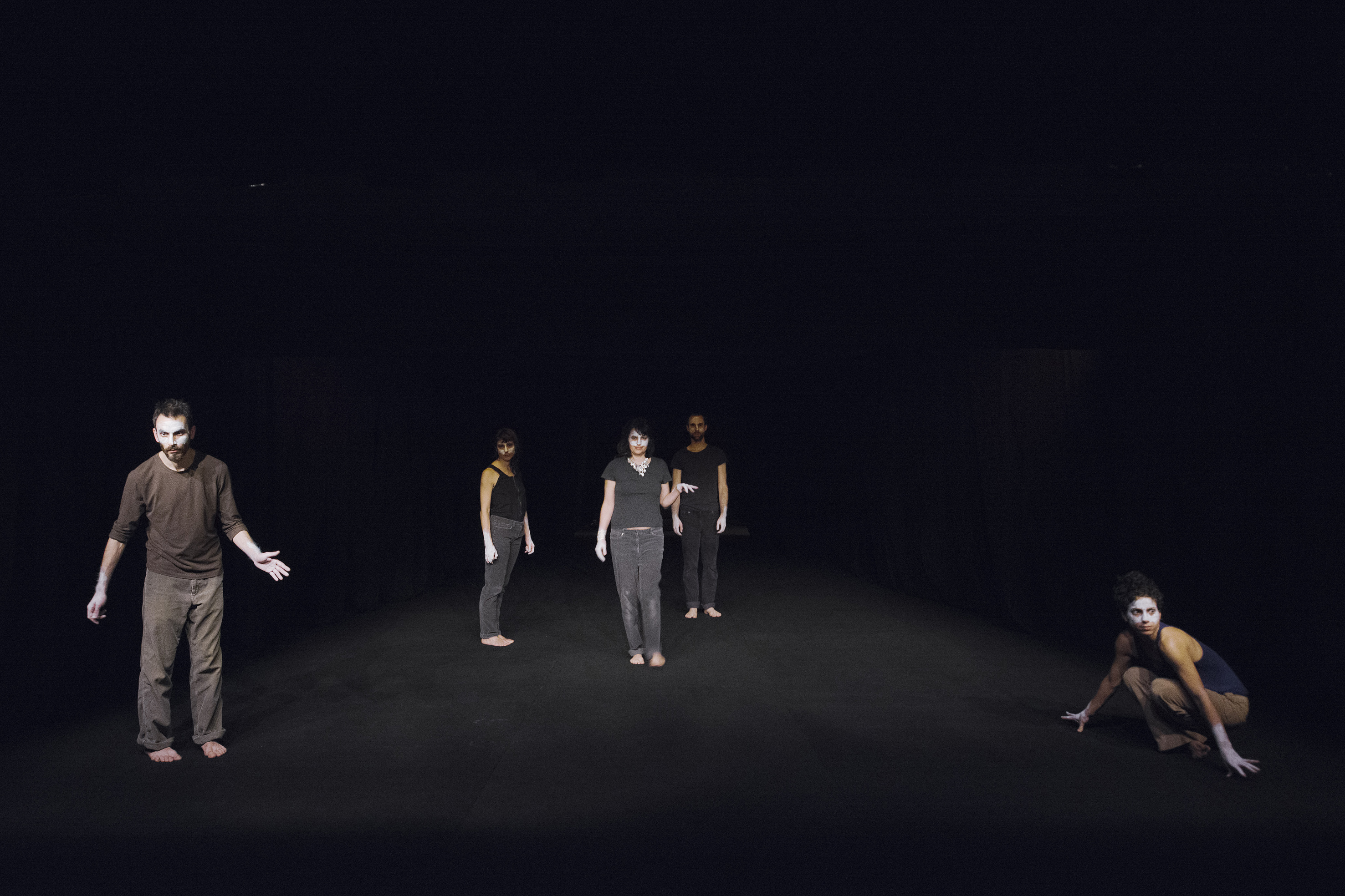 Les danses qui apparaissent ici, aussi près soient-elles de nous, aussi singulières soient-elles, aussi nues, n’en viennent pas moins de loin, comme tirées d’un fond commun, d’une histoire des arts du spectacle (opéra, cirque, music-hall, pantomime, carnaval, cabaret, danse, théâtre) charriée de bribes de souvenirs, de citations brouillées, de résidus de mouvements. Ainsi ce fard blanc qui recouvre partiellement les visages (reste d’un maquillage outrancié ou début d’un masque) convoque à lui seul ces mondes de la représentation. Et au gré des apparitions, mimiques rhétoriques, codes du burlesque, souvenirs de music-hall, restes de grâce d’un port de bras et bribes d’envolées, ou réminiscences des vertiges d’une danse-contact…ou même de luttes et théâtres enfantins, bref, un champ de traces chorégraphiques plus ou moins cernables, dont on ne sait jamais s’il s’agit de mouvements ruinés par leur usure ou de l’amorce, la promesse de nouveaux élans.