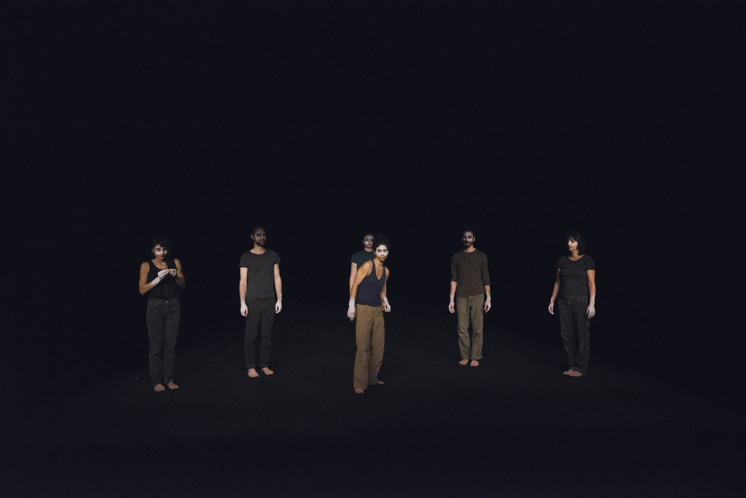 Du commun et du séparé. Un projet chorégraphique où chacun prend part, prend sa part, a sa chance, ou même ses chances. Une danse certes, mais des danses successives en présence d’un groupe qui veille. Une exposition mais des modes d’adresse, une avant-scène mais trois profondeurs en réserve : un gouffre noir, une perspective, un tableau au lointain, un face-à-face mais des yeux fermés, une face mais des visages.